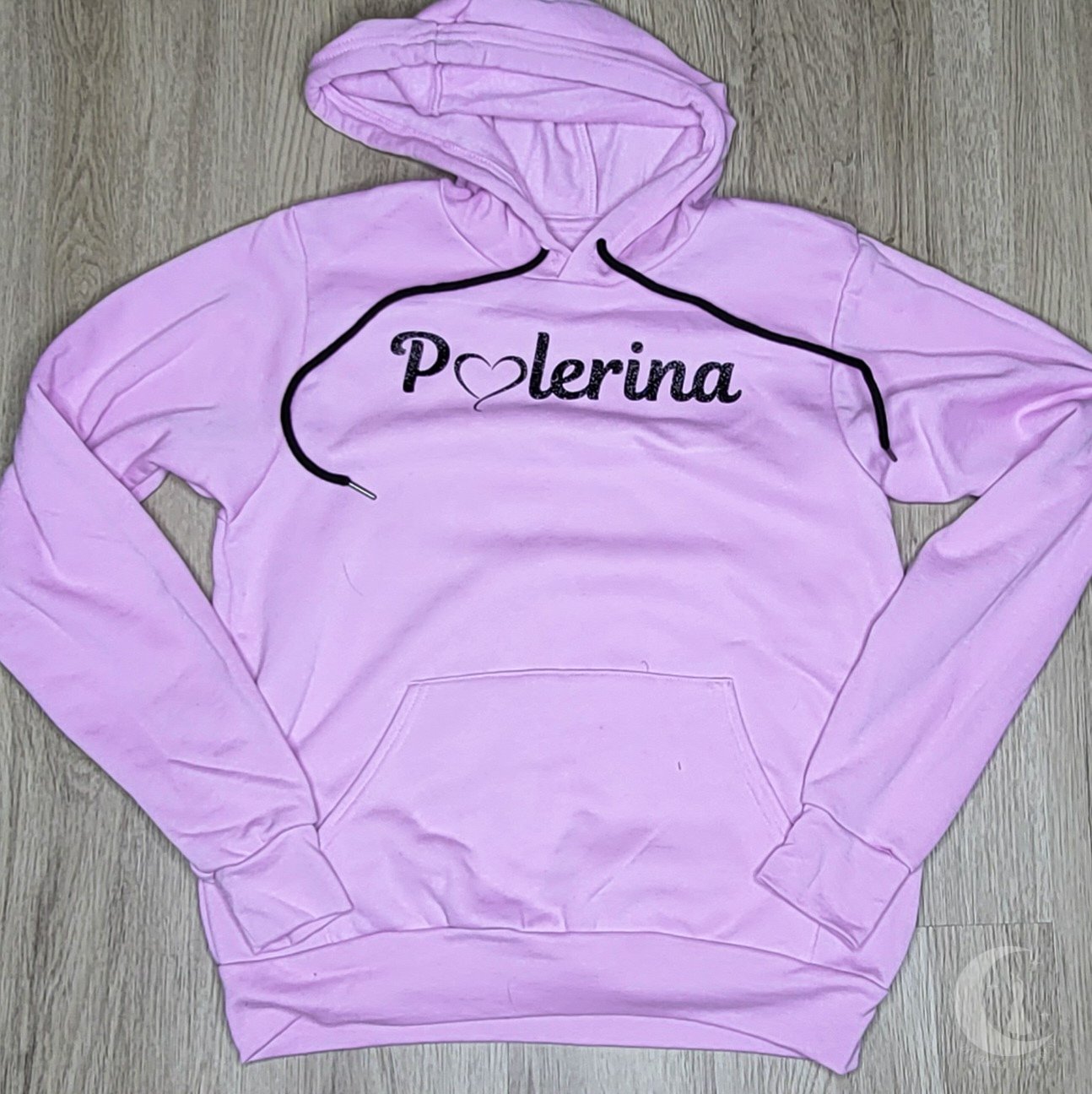 Stay warm and cozy and ready to dance in this ultra soft Polerina hoodie. This eco friendly pullover hoodie is made of a plush blend of cotton and polyester that is thin enough to feel light and comfortable while keeping you warm and toasty. The "Polerina" is written in a black glitter that doesn't flake off so you can stay comfy and stylish.